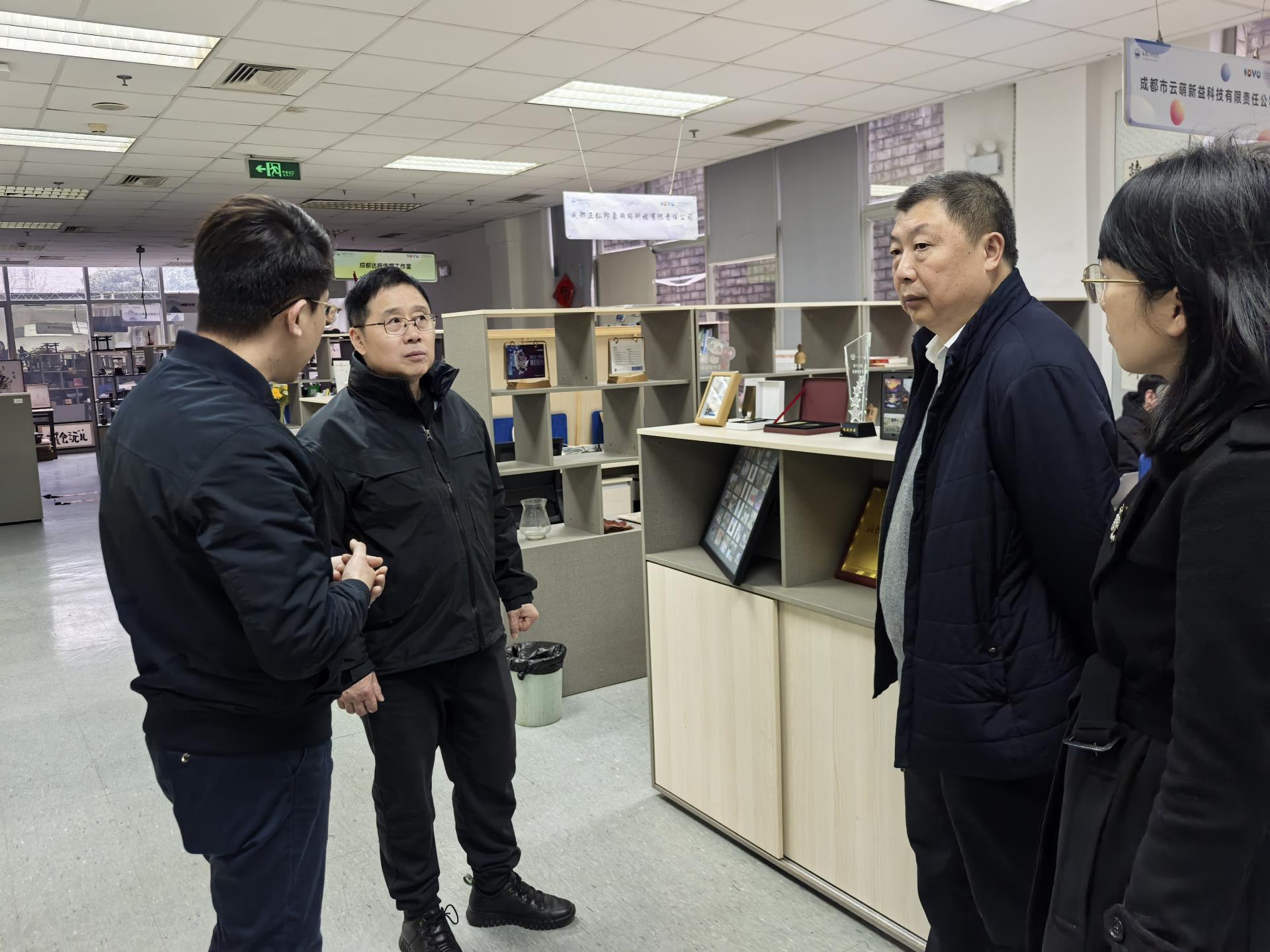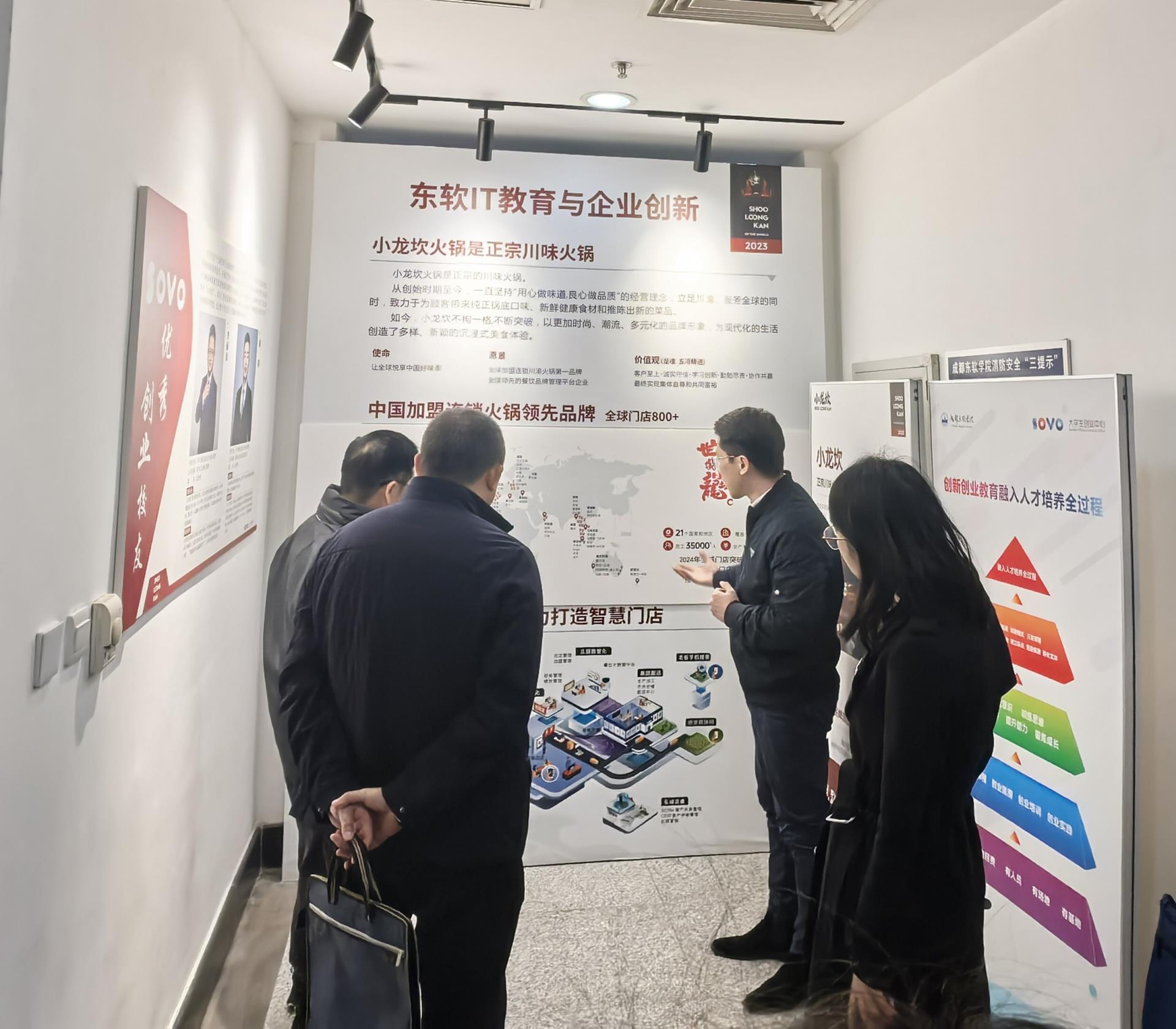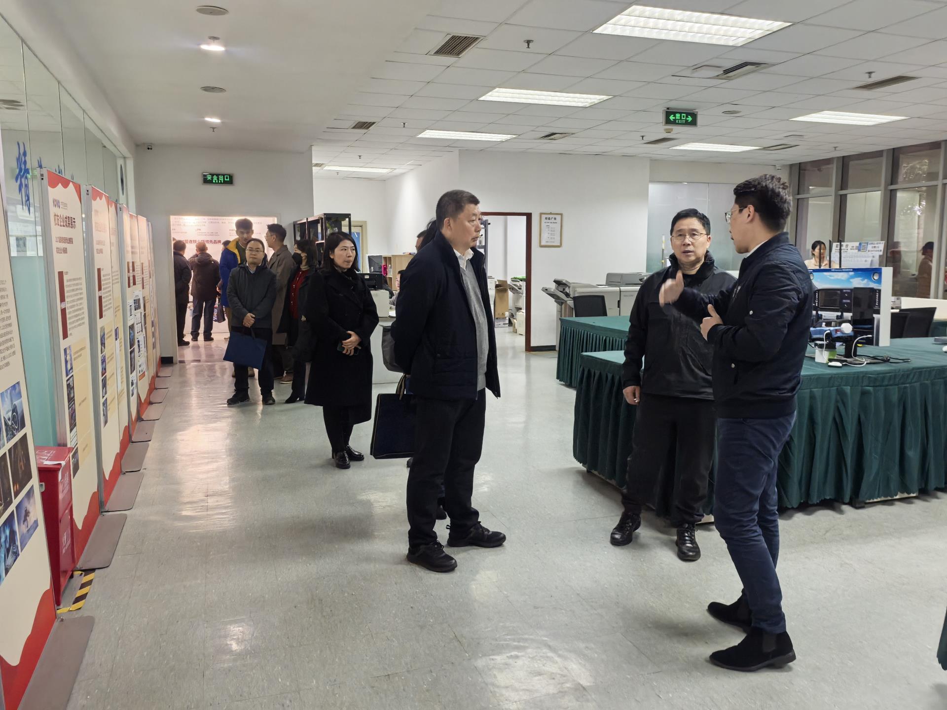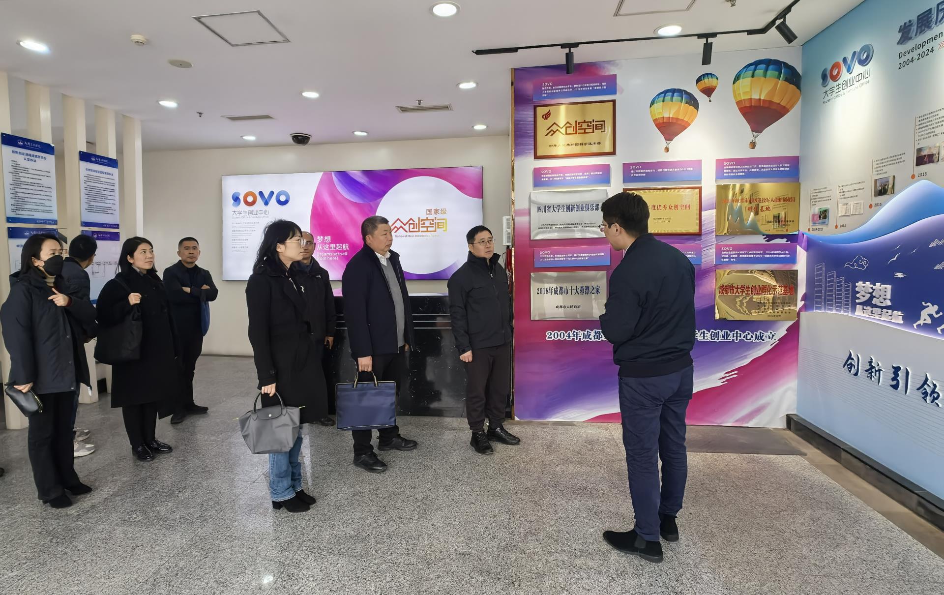 在SOVO的入户大厅内,韩庆龙主任首先向来宾们扼要概述了我校在大学生创业孵化及双创教育领域的探索与成就,并分享了SOVO杰出创业校友及其企业的情况。随后,一行人移步至SOVO国家级众创空间的在孵企业办公大厅,韩主任进一步深入阐述了当前SOVO在孵企业的多元经营范围、蓬勃的发展态势以及一系列显著成果,赢得了来宾们的好评。