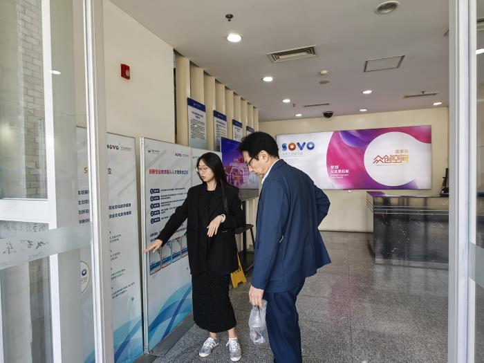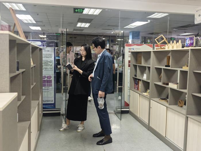 随后,在向老师的引导下,古山浩之社长一行深入探访了 SOVO 国家级众创空间的办公区域。这里充满着年轻团队的创新创业活力,向老师简要概述了在孵企业的核心业务、团队构成等基本概况,以及它们在技术创新、市场拓展方面的发展亮点。向老师还特意向来宾展示了几款SOVO在孵企业自主研发的科技和文创产品,这些融合了传统文化与现代科技的产品创意新颖、功能突出,古山社长拿起产品仔细端详,对设计理念和制作工艺赞不绝口。