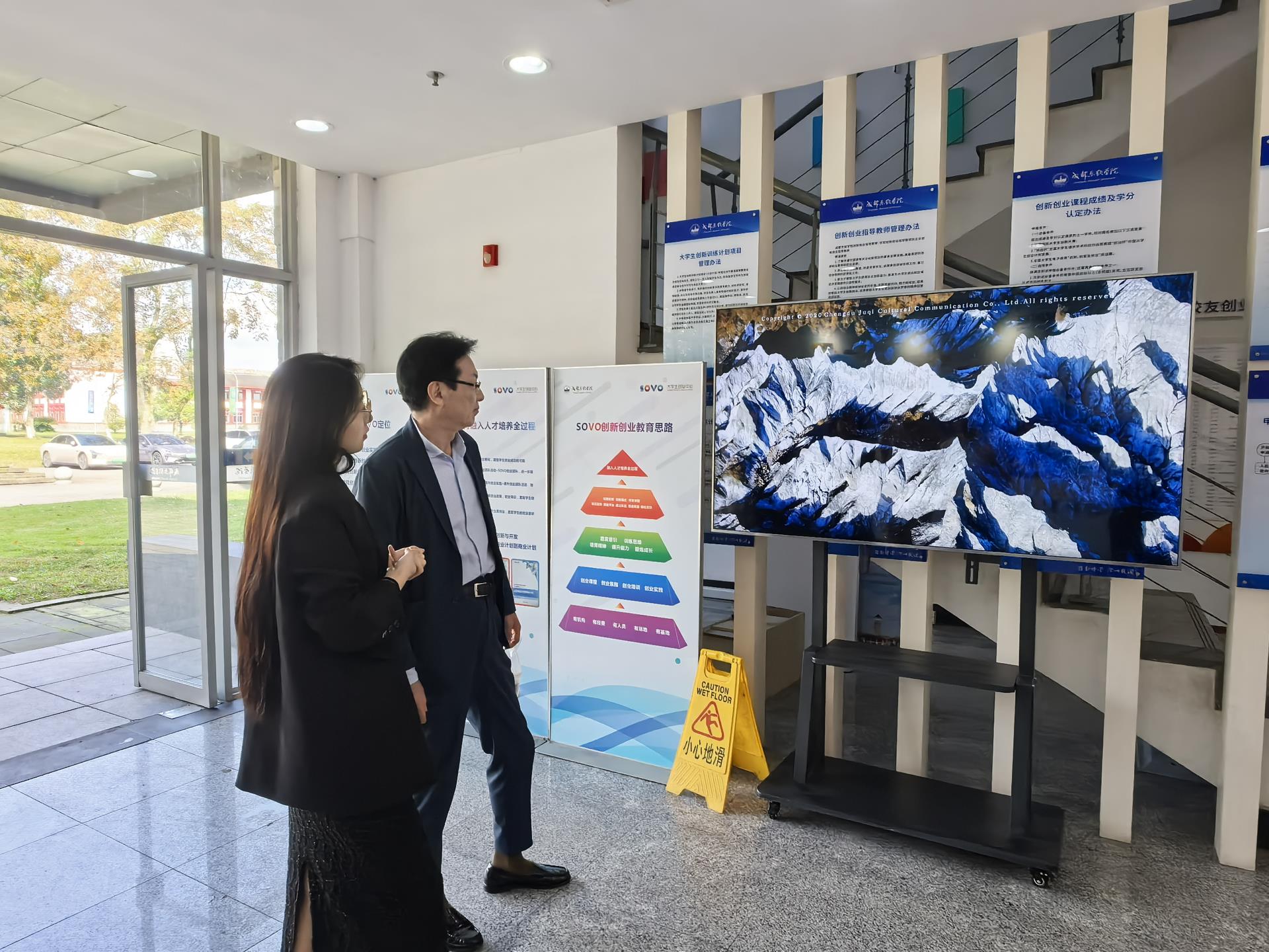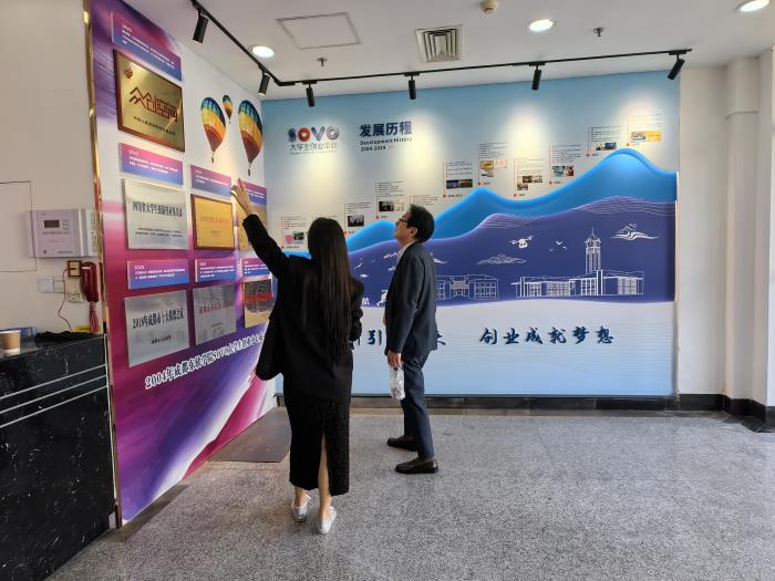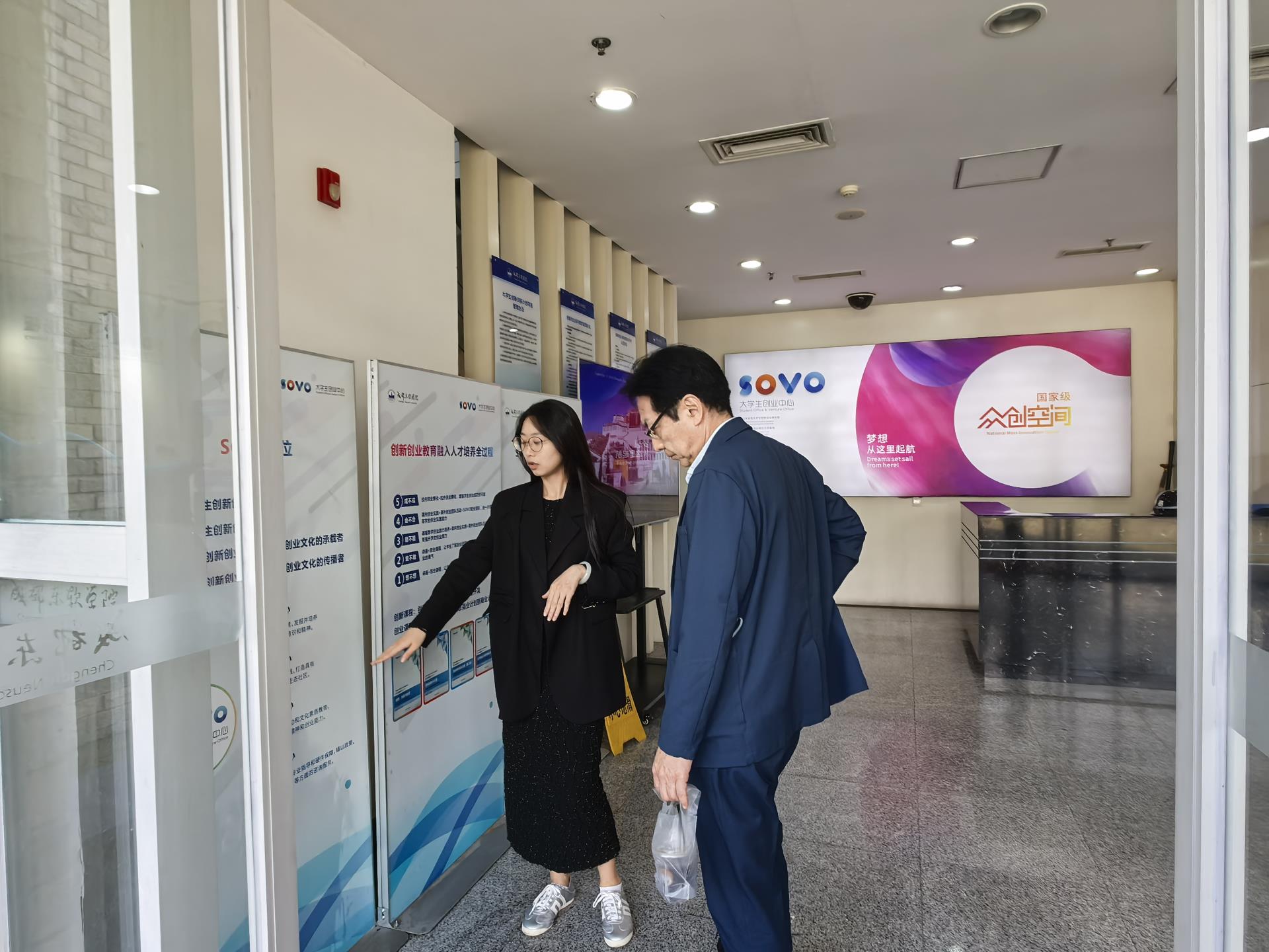 在 SOVO 接待大厅, SOVO向雪碧老师全程以流畅的日语为来宾详细介绍SOVO二十年发展历程,并着重分享了 SOVO 孵化出的优秀校友企业案例,当提及这些企业从校园项目成长为行业新锐的历程时,古山浩之社长频频点头表示赞许。