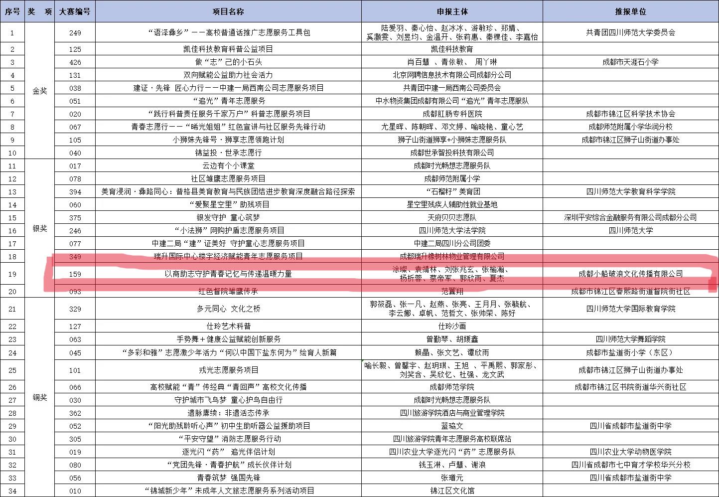 该赛事由共青团锦江区委、锦江区精神文明建设办公室、锦江区委社会工作部、锦江区教育局、锦江区科学技术协会联合主办,经线上初评、现场路演、提问答辩等环节,共评选出大赛常规赛金奖10个、银奖10个、铜奖14个,专项赛(榜样100)金奖12个、银奖17个、铜奖28个。大赛自启动以来,汇聚了中小学校、高校、社会组织、志愿服务队、企业、机关事业单位等多领域参赛,共收到常规赛与专项赛申报材料426份(非重复申报资料400份)。
