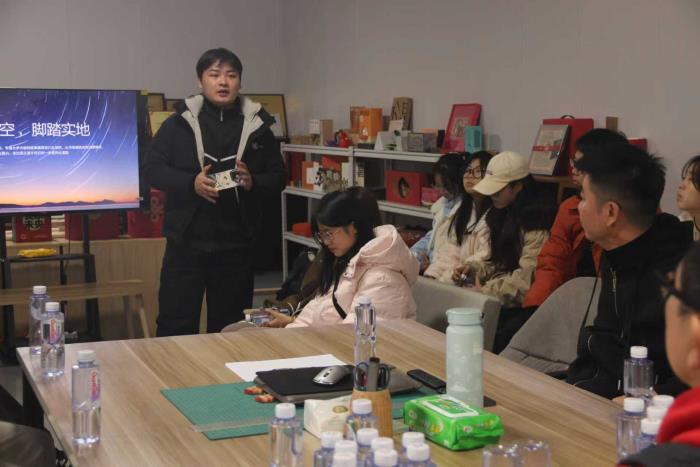 回到会客室后,吴崇敏学长以亲身经历为主线,娓娓道来其创业历程中的起伏与收获。从早期产品滞销、项目失败,到逐步找准方向、积累口碑;从文创产品设计、电商尝试,到最终聚焦于“农业+互联网”模式。他坦言曾多次经历“被毒打”,却也从每一次实践中汲取了宝贵经验。他在分享中提到,在小城市创业竞争较小,产业模式不成熟,会有更多的机会机遇,并建议学弟学妹“先去大城市历练,再回乡寻找机会”。