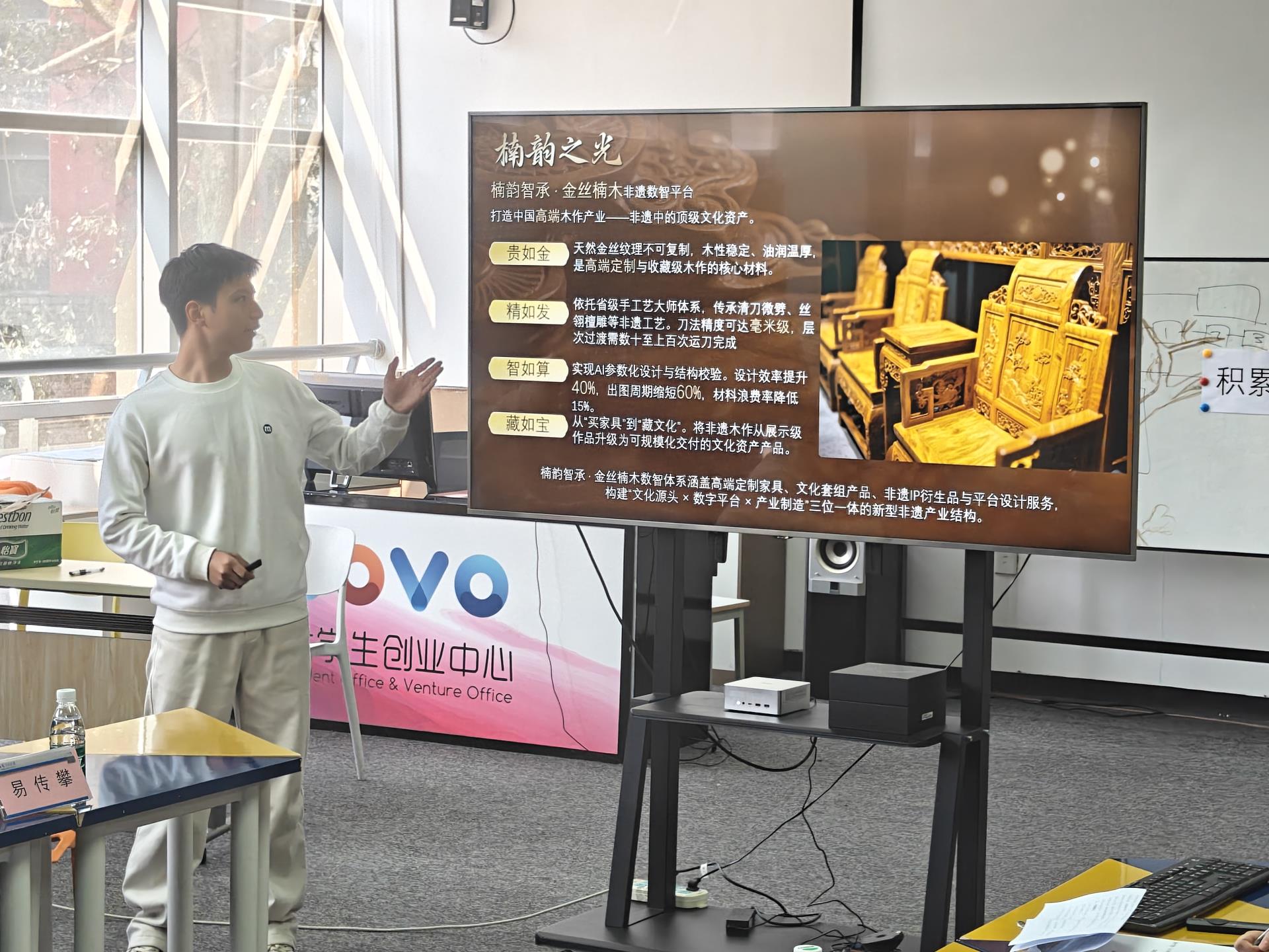 在SOVO迎宾大厅,SOVO孵化活动管理办公室主任韩庆龙老师向代表团全面且细致地介绍了学校在大学生创业孵化以及双创教育领域的整体布局与发展情况。他不仅分享了SOVO众多杰出创业校友及其企业的成功经验,更通过一个个鲜活的案例,生动展现了学校在创新创业人才培养方面所取得的显著成果,让代表团成员对我校的双创教育与孵化工作有了直观而深入的认识。