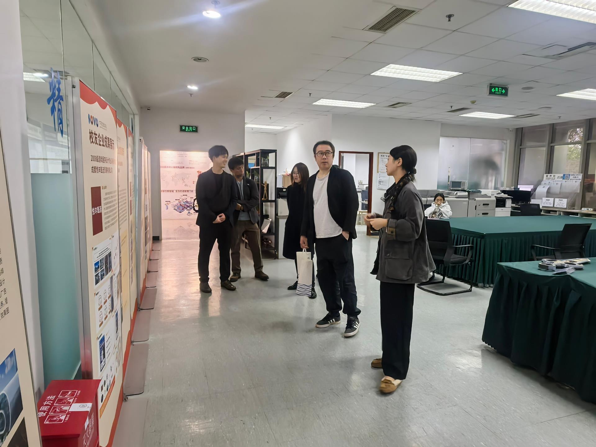 随后,雪碧老师带领客人深入SOVO国家级众创空间办公区域,分享了多个SOVO成功孵化的优秀校友企业案例。这些鲜活的实践样本引发了客人的广泛共鸣,赢得了频频赞许。她还简要介绍了在孵企业的整体运营态势与发展现状,帮助日方客人快速构建了对众创空间内创业生态的直观认知。参观期间,客人们还兴致盎然地驻足于SOVO在孵企业的文创、科技产品展示区,对这些兼具创意与活力的产品给予了高度评价。