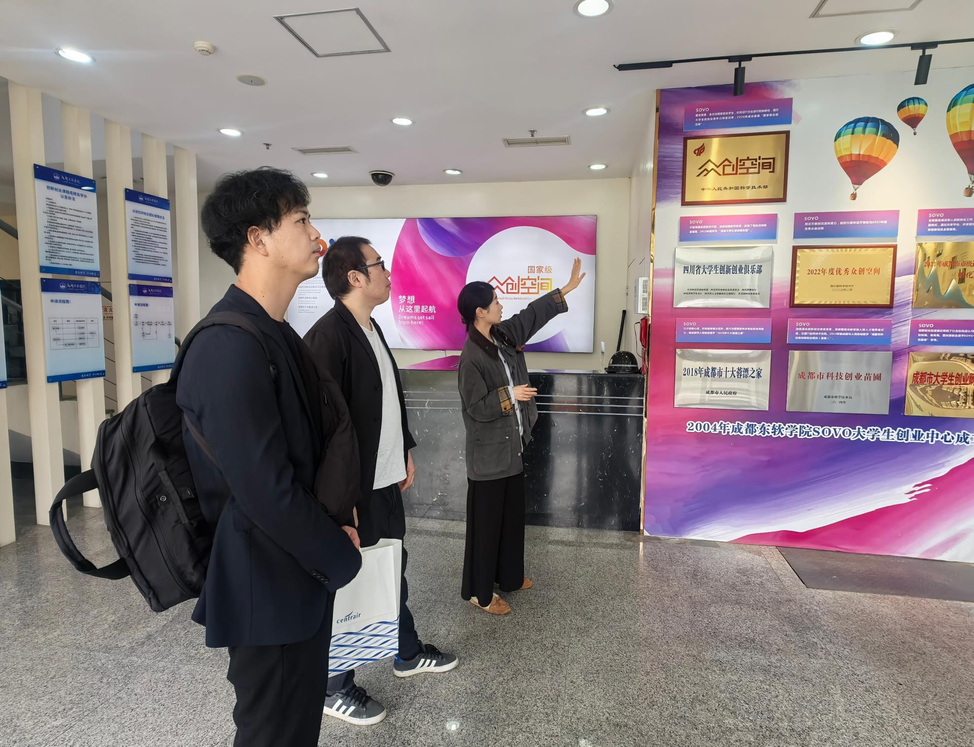 在SOVO接待大厅,雪碧老师热情迎接待了远道而来的日方客人。她以流利的日语,全面且细致地介绍了SOVO的发展沿革、组织架构与功能布局,重点阐述了SOVO二十余年来在创新创业教育领域深耕所取得的一系列丰硕成果。