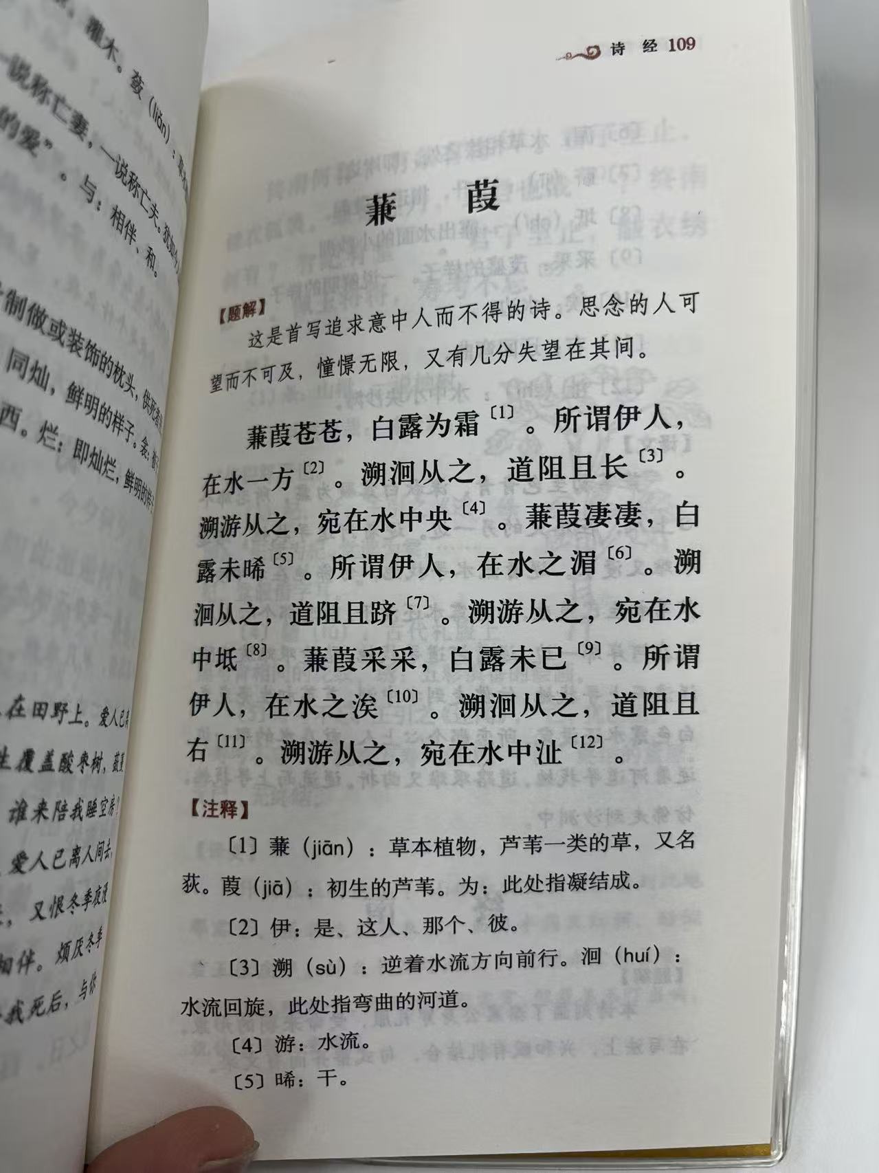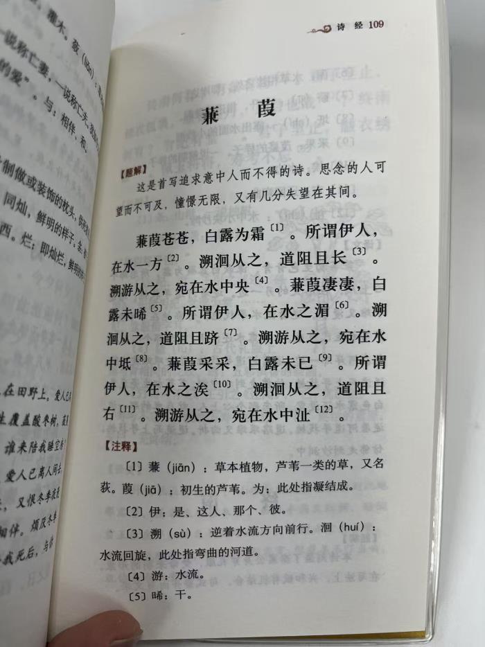 随后,张老师重点为同学们解读了《关雎》和《蒹葭》这两篇脍炙人口的诗作。《关雎》作为《诗经》的开篇之作,写的是君子对淑女的思慕与追求。“关关雎鸠,在河之洲。窈窕淑女,君子好逑。”诗中用雌雄相鸣的水鸟起兴,引出男子对心仪女子的深切爱慕。张老师细细讲解道,男子“寤寐思服”“辗转反侧”,将思念之苦写得淋漓尽致。而最为动人的是,这份情感始终保持着“发乎情,止乎礼”的克制与美好——他幻想“琴瑟友之”“钟鼓乐之”,用音乐去亲近她、取悦她,表达了对爱情真诚而庄重的态度。而《蒹葭》则呈现出另一种意境。“蒹葭苍苍,白露为霜。所谓伊人,在水一方。”深秋清晨,芦苇苍青,白露凝霜,诗人所追寻的“伊人”隐约在水的那一边。张老师引导同学们感受诗中那种可望而不可即的惆怅——无论逆流而上还是顺流而下,“伊人”始终在水中央,若隐若现,飘忽不定。张老师特别指出,这首诗意境空灵悠远,既是一首优美的情诗,也可理解为对理想、对美好境界的执着追寻,千百年来引发无数读者的共鸣。