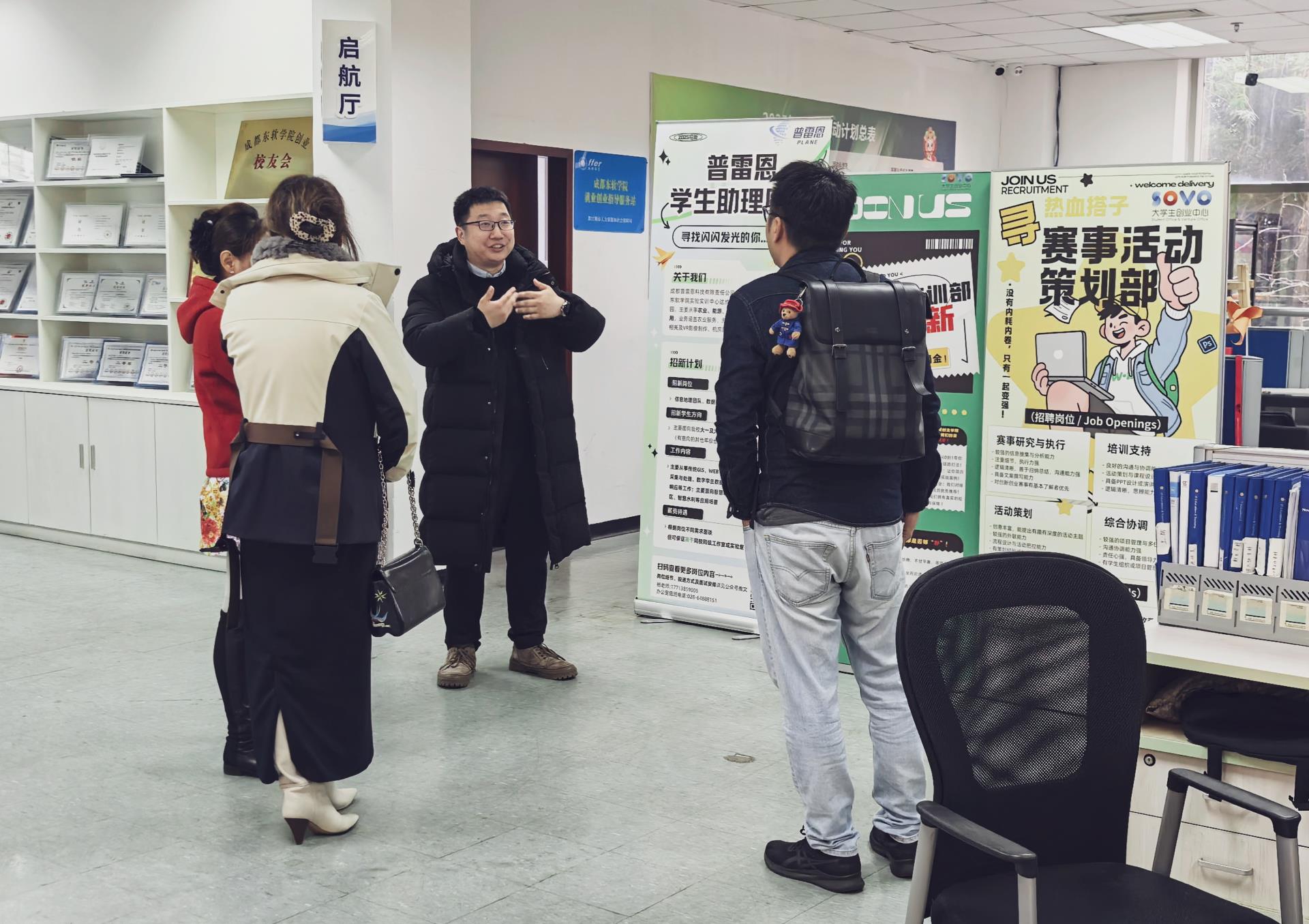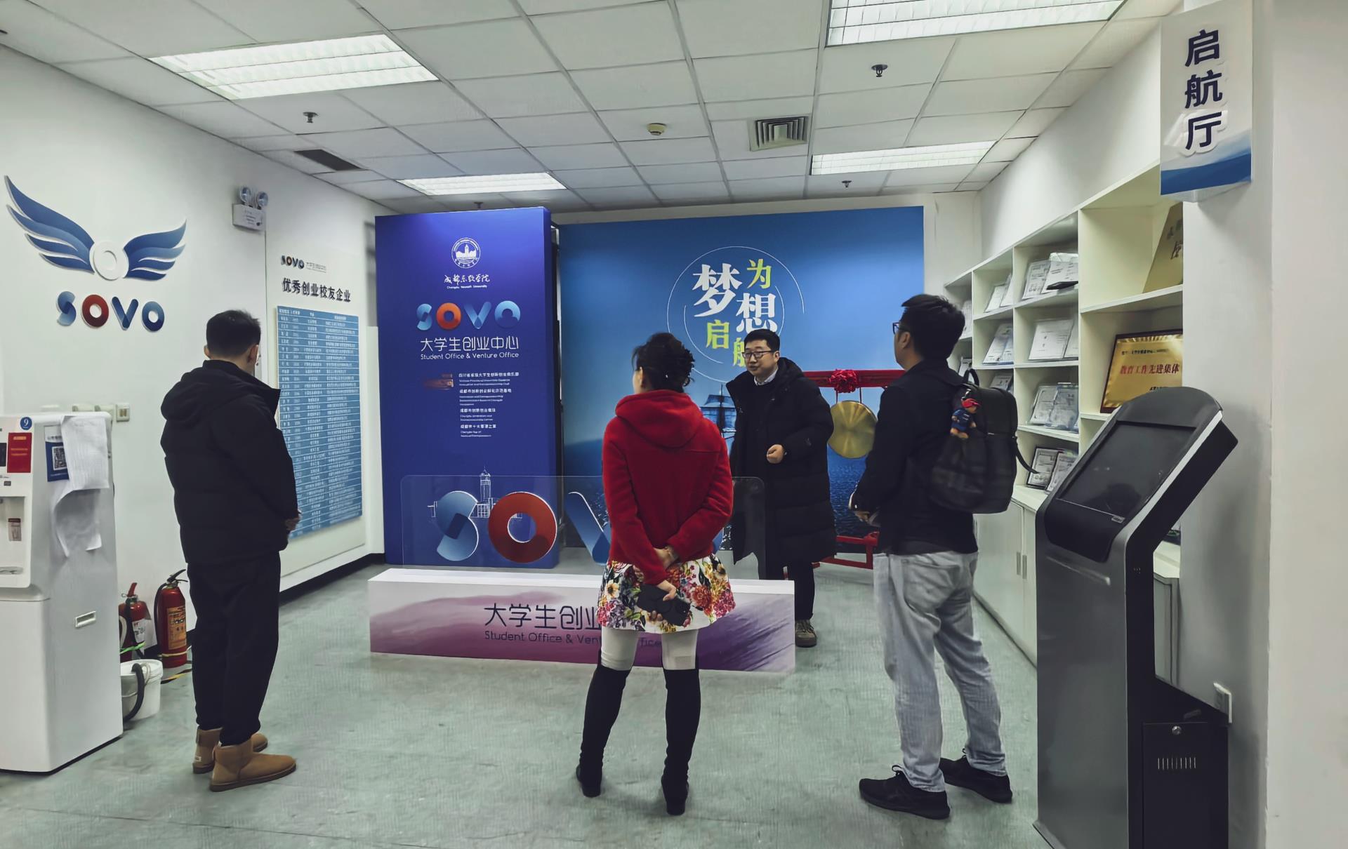一行人来到SOVO二楼启航厅,何畅副院长向来宾们介绍了SOVO创业企业独特的敲锣开业仪式,以及学院对大学生创业企业和团队的孵化与管理模式。之后,来宾们还参观了SOVO创新工坊,并深入了解了我院创新课程《设计思维DT》的特色与优势。