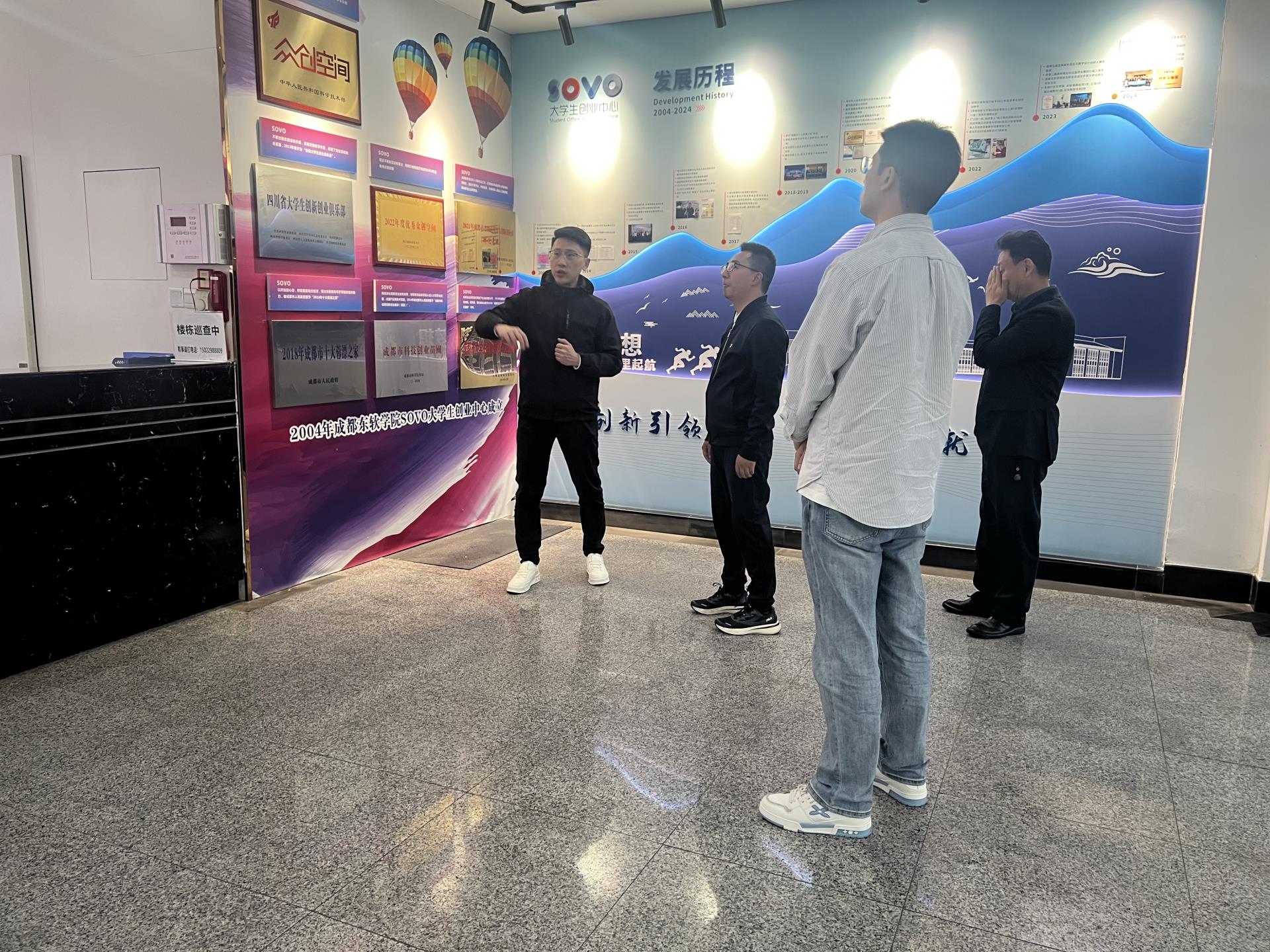 4月16日下午,四川科技职业学院学生工作部部长伍希、马克思主义学院院长裴东等一行4人,在我校学工部部长艾珏宇的陪同下,莅临创新创业学院(SOVO)参观交流。创新创业学院(SOVO)孵化活动管理办公室主任韩庆龙热情接待了来访的兄弟院校客人。