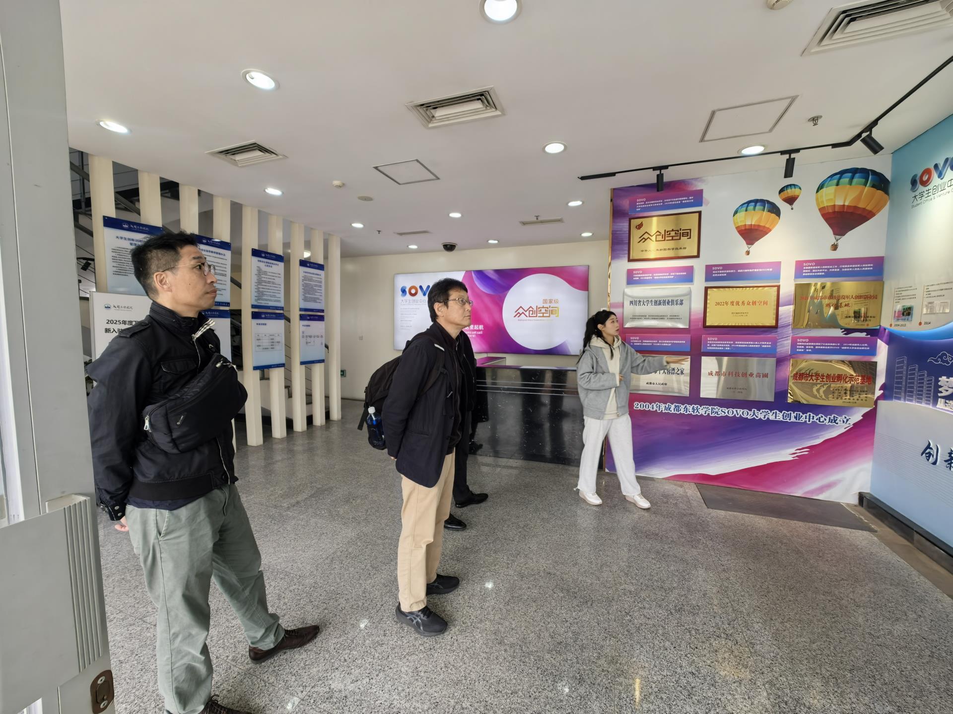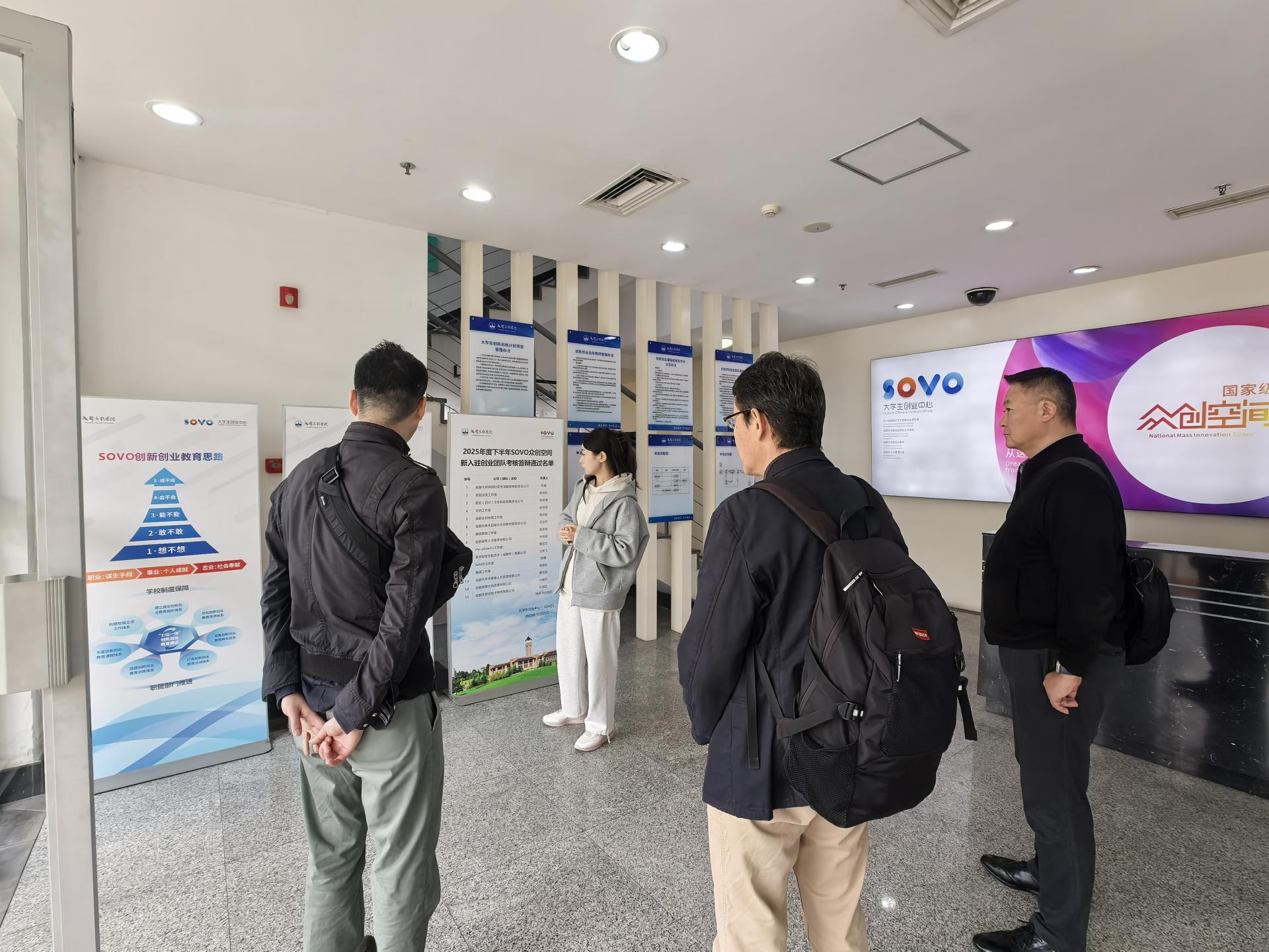 在SOVO接待大厅,SOVO孵化活动管理办公室韩庆龙主任与向雪碧老师热情迎接了远道而来的客人。随后,向雪碧老师以流利的日语,向代表团成员详细介绍了SOVO的发展历程、组织架构、功能布局,以及过去二十余载在创新创业领域所取得的丰硕成果。期间,向老师特别分享了SOVO成功孵化的优秀校友企业案例,这些鲜活的成功范例,充分展现了学院在创新创业孵化与教育方面取得的成效。