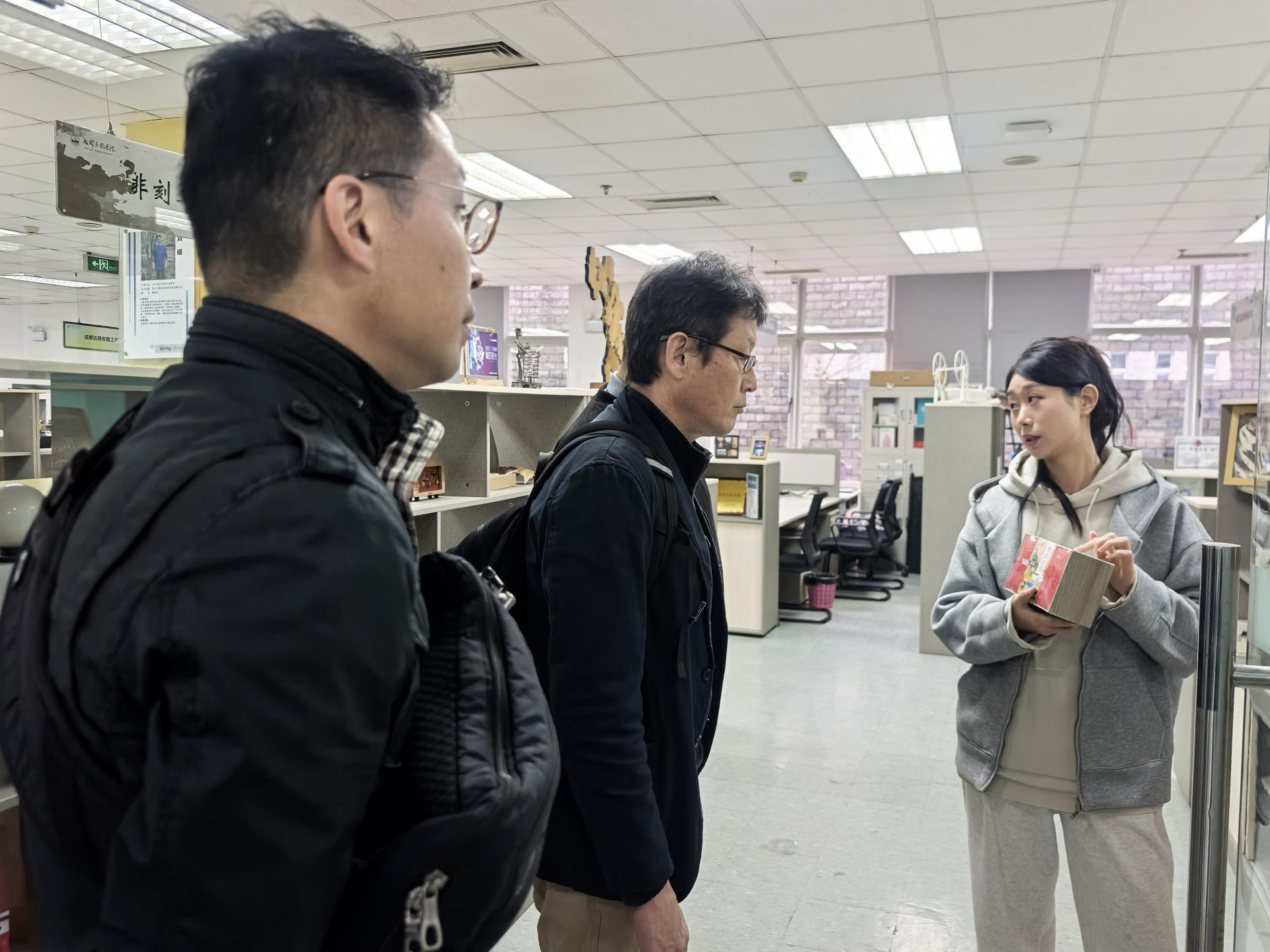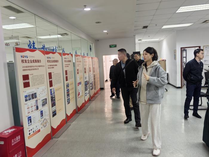 紧接着,代表团成员深入探访了SOVO国家级众创空间的办公区域。向雪碧老师简要概述了在孵企业的基本情况与发展亮点,让来宾们对众创空间内的创业生态有了初步了解。在参观过程中,代表团成员饶有兴致地欣赏了SOVO在孵企业展示的文创产品,这些充满创意与活力的作品,引得他们纷纷驻足。同时,来宾们还详细询问了学校大学生创业企业的申请流程以及相关扶持政策,表现出对学校创新创业环境的浓厚兴趣。