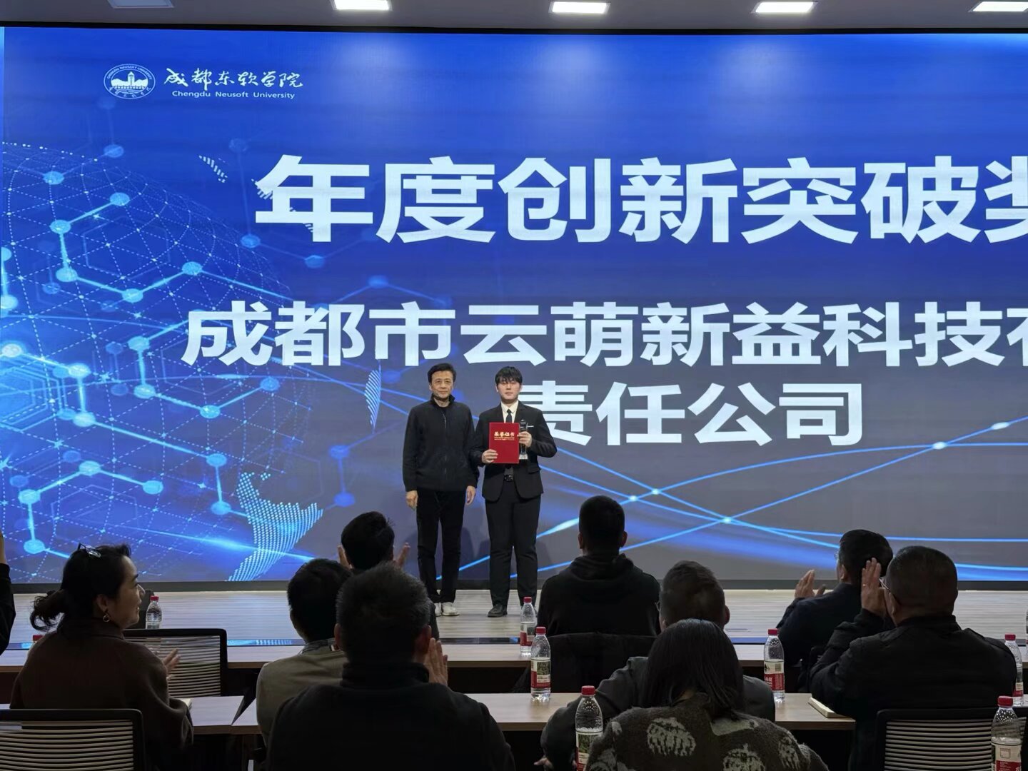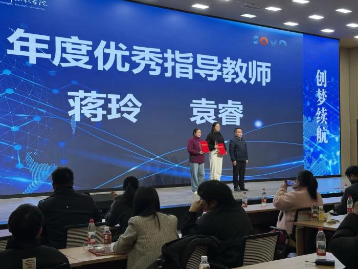 年会现场颁发四大奖项,表彰双创先锋:蒋玲、袁睿两位教师荣获“年度优秀指导教师奖”;“年度创新突破奖”——成都市云萌新益科技有限责任公司;“年度创客先锋奖”——成都市青城岁月留声文化传媒有限责任公司;“年度创业新锐奖”——成都星原赋维科技有限公司。