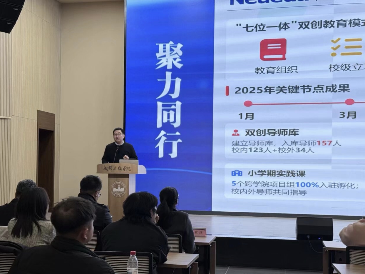 在年度总结环节,创新创业学院(SOVO)何畅为副院长以“数据可视化”形式呈现了2025年SOVO在创业企业孵化、创业团队指导、国家级和省级双创赛事、双创平台建设,双创课程体系改革、双创导师资源建设方面取得的成绩。
